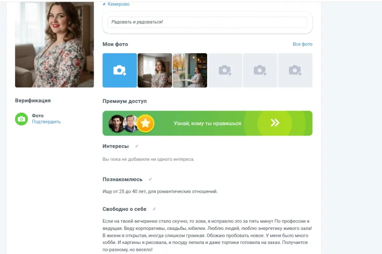 Представьте себе уверенную в себе женщину. Ведущую мероприятий, с яркой помадой, любящую красивые платья. Но лишний вес. 85 кг при росте 172 см. Вероника в своей анкете честно об этом сказала, написав, что сексуальность — это про состояние души, а не размер одежды. А ещё она, веселушка-хохотушка, искала мужчину, с которым можно будет болтать о чём угодно.