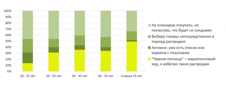 Почти половина опрошенных (49%) старше 55 лет уверены, что Чёрная пятница — маркетинговый ход, и избегает таких распродаж. 34% бумеров не планируют совершать покупки, но будут следить за интересными для себя предложениями, а 15% опрошенных выберут товары непосредственно в период распродаж. Только 2% опрошенных данной возрастной категории сообщили, что уже подготовили список покупок к периоду проведения акций.