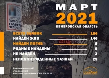 Волонтёры поисково-спасательного отряда «Лиза Алерт» обнародовали итоги работы поисковиков в марте. За месяц в отряд поступили 186 заявок, найдены 154 человека.