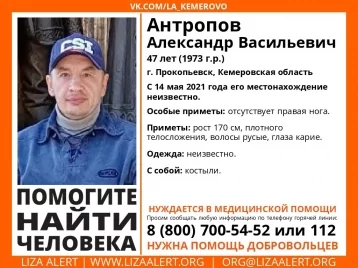 В Кузбассе пропал 47-летний житель Прокопьевска Александр Антропов. Местонахождение мужчины неизвестно с 14 мая.
