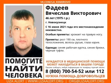 В Кемеровской области без вести пропал житель Новокузнецка Вячеслав Викторович Фадеев. Местонахождение 46-летнего мужчины неизвестно с 16 июня.