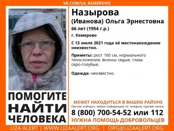 В Кемерове без вести пропала Ольга Эрнестовна Назырова (Иванова). Местонахождение 66-летней женщины неизвестно с 13 июля.