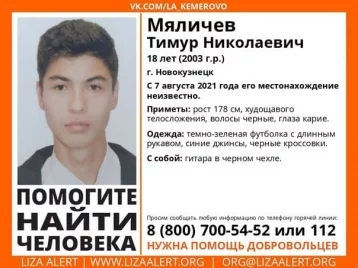В Новокузнецке ищут без вести пропавшего 18-летнего Тимура Мяличева. О поисках молодого человека объявили волонтёры отряда «Лиза Алерт Кузбасс». О местонахождении кузбассовца ничего не известно с 7 августа 2021 года.