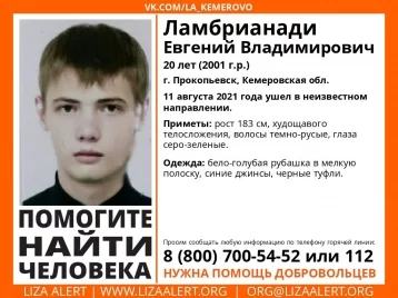В Прокопьвске без вести пропал 20-летний Евгений Владимирович Ламбрианади. 11 августа он ушёл в неизвестном направлении. Об этом сообщили в ПСО «Лиза Алерт Кузбасс».