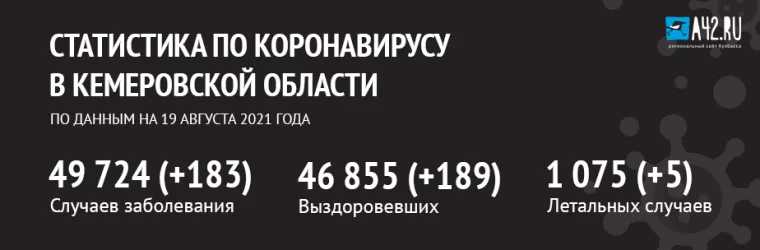 В Кемеровской области, по данным на 19 августа 2021 года, зарегистрировано 49 724 случая заражения коронавирусом. За последние сутки в регионе COVID-19 диагностировали у 183 пациентов.