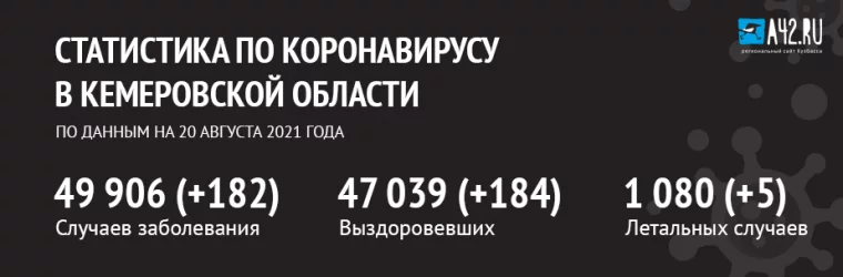 В Кемеровской области, по данным на 20 августа 2021 года, зарегистрировано 49 906 случаев заражения коронавирусом. За последние сутки в регионе COVID-19 диагностировали у 182 пациентов.
