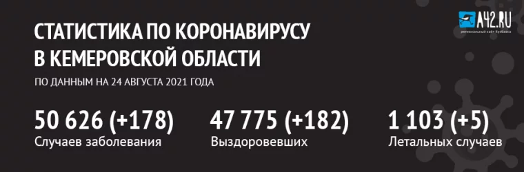 В Кемеровской области, по данным на 24 августа 2021 года, зарегистрировано 50 626 случаев заражения коронавирусом. За последние сутки в регионе COVID-19 диагностировали у 178 пациентов.