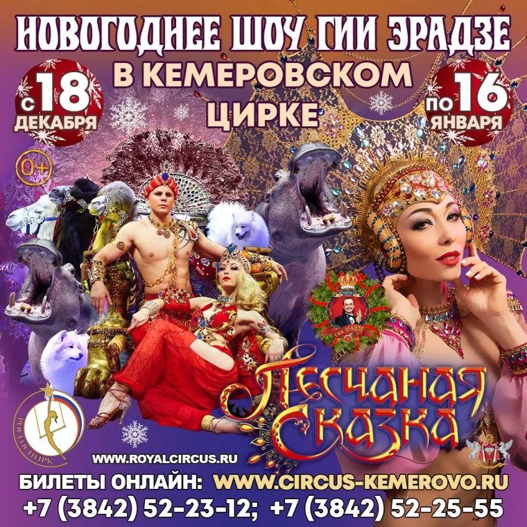С 18 декабря по 16 января в Кемерове пройдут гастроли циркового шоу заслуженного артиста России Гии Эрадзе. Гостей ждёт грандиозный новогодний спектакль с титулованными представителями Росгосцирка, авторскими декорациями и эксклюзивными костюмами. Готовьтесь ощутить невероятный контраст холодных ночей пустыни и тепла оазиса: главная тема представления — таинственный Восток.