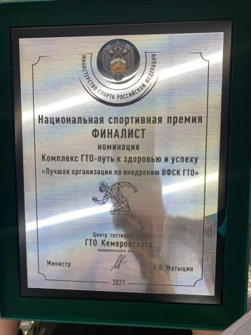 Также в тройку финалистов в номинации «Комплекс ГТО — путь к здоровью и успеху: лучшая организация по внедрению Всероссийского физкультурно-спортивного комплекса „Готов к труду и обороне“ (ГТО)» вошёл Центр тестирования ГТО Кемеровского муниципального округа.