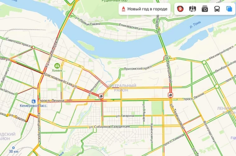 Загружен и сам Кузнецкий проспект — от моста до Автозаводской улицы; стоят Советский, Красноармейская и проспект Ленина — на участке от вокзала до Соборной. На втором городском мосту, Кузбасском, также пробки — улица Терешковой стоит в обе стороны.