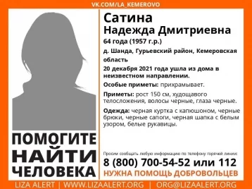 В Кузбассе ищут жительницу деревни Шанда Гурьевского района Сатину Надежду Дмитриевну. Её местонахождение неизвестно с 20 декабря.