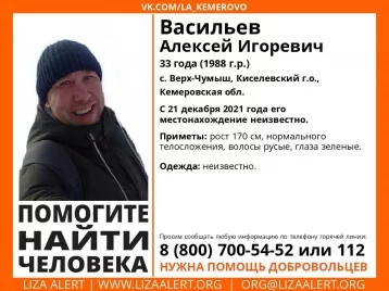 В Киселёвске разыскивают пропавшего Алексея Игоревича Васильева. О 33-летнем жителе села Верх-Чумыш ничего не известно с 21 декабря.