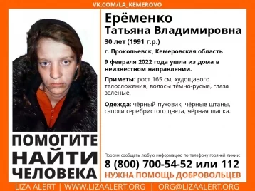 В Прокопьевске разыскивают пропавшую Татьяну Владимировну Ерёменко 1991 года рождения. 9 февраля она ушла из дома в неизвестном направлении и до настоящего времени не вернулась.