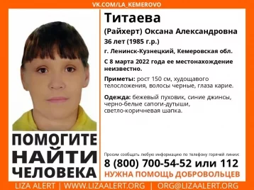 Волонтёры поискового отряда «ЛизаАлерт» Кузбасс просят помощи в поисках 36-летней Титаевой (Райхерт) Оксаны Александровны.