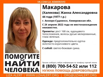 В Анжеро-Судженске пропала Жанна Александровна Макарова 1977 года рождения. О её местонахождении ничего не известно с 24 апреля, сообщили волонтёры поисково-спасательного отряда «Лиза Алерт».