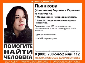 В Междуреченске больше недели разыскивают без вести пропавшую Веронику Юрьевну Пьянкову 1981 года рождения. О её местонахождении ничего не известно с 1 мая, сообщают волонтёры поисково-спасательного отряда «Лиза Алерт».