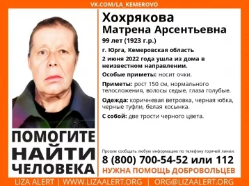 В Юрге пропала 99-летняя пенсионерка. Женщина ушла из дома в неизвестном направлении сегодня, 2 июня.