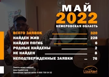 Волонтёры кузбасского отделения поисково-спасательного отряда «Лиза Алерт» озвучили данные о поисковых работах в мае 2022 года. За месяц в отряд поступило 320 заявок на поиск людей.