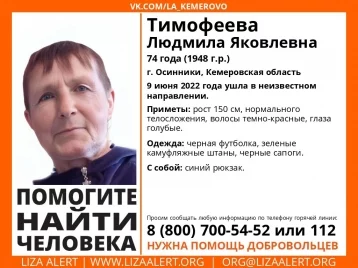 В Осинниках пропала 74-летняя Людмила Тимофеевна Яковлева. О начале поисков сообщили волонтёры поисково-спасательного отряда Лиза Алерт.
