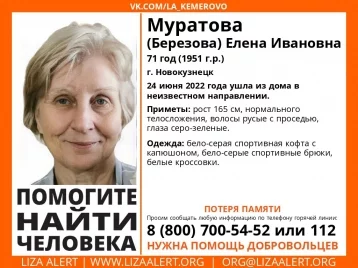 В Новокузнецке пропала 71-летняя женщина. 24 июня она ушла из дома в неизвестном направлении, сообщают волонтёры поискового отряда «Лиза Алерт».