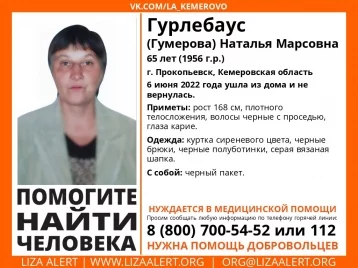 В Прокопьевске пропала 65-летняя женщина. Она ушла из дома ещё 6 июня, после чего не вернулась, сообщили волонтёры поискового отряда «Лиза Алерт» в Кузбассе.