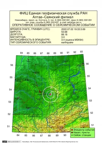 Как следует из опубликованных данных, землетрясение было зафиксировано в 2:33 воскресенья, 3 июля, в точке с координатами 53.68 широты и 88.18 долготы — рядом с Междуреченском. Интенсивность в эпицентре составила 3,4 балла по шкале MSK64, слабые толчки дошли до Новокузнецка и Прокопьевска.