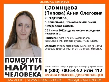 В Прокопьевском муниципальном округе разыскивают без вести пропавшую Анну Олеговну Савинцву 1990 года рождения. С 21 июля о местонахождении жительницы посёлка Спиченково ничего не известно, сообщают волонтёры поисково-спасательного отряда «Лиза Алерт».