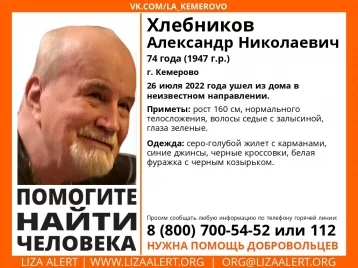 В Кемерове пропал 74-летний мужчина. Он ушёл из дома 26 июля, после чего не вернулся, сообщили волонтёры поискового отряда «Лиза Алерт».
