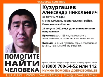 48-летний мужчина пропал без вести в селе Усть-Кабырза в Таштагольском районе. О его местонахождении информации нет с 23 августа