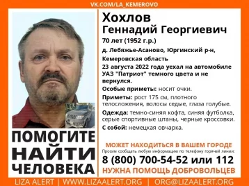 70-летний мужчина уехал на автомобиле УАЗ «Патриот» тёмного цвета, также он взял с собой немецкую овчарку, сообщают волонтёры поискового отряда «Лиза Алерт».