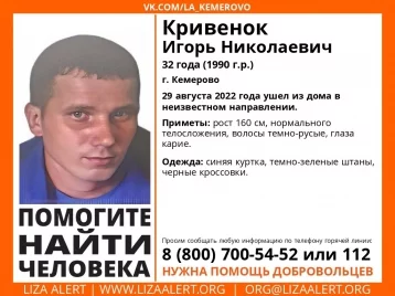 Пропавший был одет в синюю куртку, тёмно-зелёные штаны и чёрные кроссовки. Рост жителя Кемерова 160 сантиметров, нормального телосложения, тёмно-русые волосы, глаза карие.