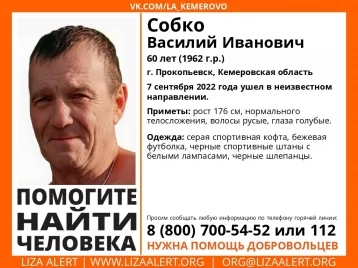 В Прокопьевске пропал 60-летний мужчина. 7 сентября он ушёл в неизвестном направлении, сообщают волонтёры поискового отряда «Лиза Алерт».