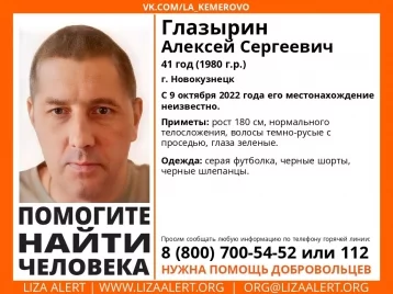 Как сообщили волонтёры поискового отряда «Лиза Алерт» в Кузбассе, мужчина ростом 180 см, нормального телосложения, волосы тёмно-русые с проседью, глаза зелёные. Он был в серой футболке и чёрных шортах. Обут в чёрные шлёпанцы.