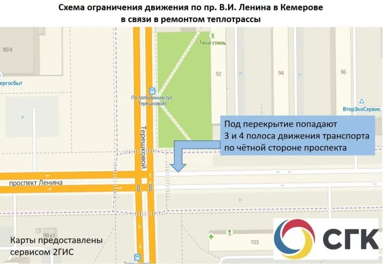 В Кемерове с вечера 14 октября до утра 17 октября ограничат движение транспорта по проспекту Ленина — на участке у пересечения с улицей Терешковой. Об этом сообщили в Сибирской генерирующей компании.