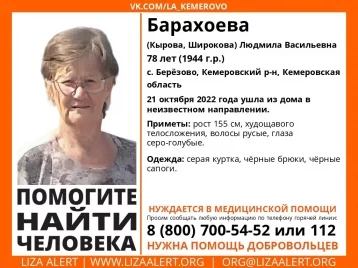 В Кемеровской области разыскивают пропавшую без вести 78-летнюю Людмилу Васильевну Барахоеву (Кырову, Широкову). Информация об этом появилась в сообществе «Лиза Алерт» Кузбасс во ВКонтакте.