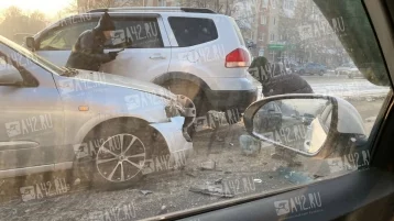 На пересечении проспекта Ленина и улицы Дзержинского столкнулись две иномарки. Внедорожник, который стал одним из участников ДТП, оказался на трамвайных путях. У автомобилей видны незначительные повреждения кузовов.