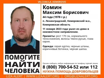 В Кемеровском муниципальном округе ищут пропавшего Максима Борисовича Комина 1978 года рождения. Житель посёлка Ленинградский ушёл из дома в неизвестном направлении 11 января.