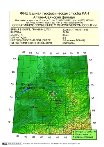 Согласно опубликованной информации, сейсмособытие произошло во вторник, 17 января, в 8:49 по местному времени. Подземные толчки зафиксированы в точке с координатами 54.28 широты и 86.24 долготы — на территории Беловского муниципального округа. Магнитуда составила 2,5, интенсивность в эпицентре — 2,6 балла (по шкале MSK64).