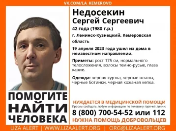 Недосекин Сергей Сергеевич 1980 года рождения ушёл из дома в неизвестном направлении 19 апреля. Его местонахождение на данный момент не установлено.