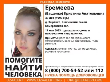 В деревне Зырянка Яшкинского округа пропала Кристина Еремеева. 30-летняя женщина ушла из дома в неизвестном направлении 13 мая.