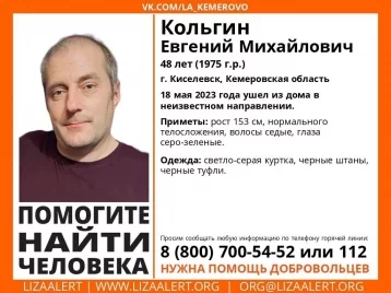 Волонтёры поискового отряда «Лиза Алерт» в Кемеровской области сообщили об исчезновении жителя Киселёвска. Кольгин Евгений Михайлович 1975 года рождения ушёл из дома в неизвестном направлении 18 мая текущего года.