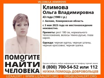 В Белове разыскивают пропавшую без вести 43-летнюю Ольгу Климову. Сообщение об этом опубликовано в группе «Лиза Алерт» Кузбасс во «ВКонтакте».