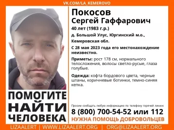 Местонахождение Покосова Сергея Гаффаровича остаётся неизвестным с 28 мая текущего года. Рост пропавшего — 178 сантиметров, телосложение нормальное. Волосы светло-русые, глаза голубые.
