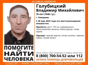 В Кемерове без вести пропал пожилой мужчина. О поисках Владимира Михайловича Голубицкого 1946 года рождения сообщили волонтёры ПСО «Лиза Алерт».
