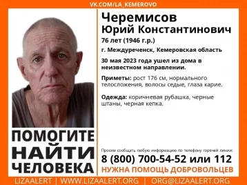 Житель Междуреченска, Черемисов Юрий Константинович, пропал без вести 30 мая, о чём сообщили в поисково-спасательном отряде «Лиза Алерт» в Кузбассе. Горожанин ушёл из дома в неизвестном направлении и не вернулся.