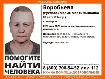 Волонтёры поисково-спасательного отряда «Лиза Алерт» в Кузбассе сообщили о начале поисков кемеровчанки 1934 года рождения. Местонахождение Воробьёвой (Рухловой) Марии Мартимьяновны остаётся неизвестным с 26 мая текущего года.