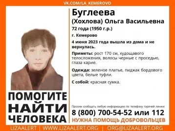 В Кемерове пропала 72-летняя Ольга Буглеева. В воскресенье, 4 июня, она ушла из дома и не вернулась.