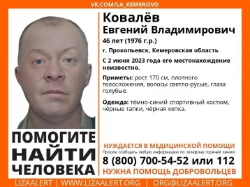 Волонтёры поисково-спасательного отряда «Лиза Алерт» в Кемеровской области сообщили об исчезновении прокопчанина 1976 года рождения. Местонахождение Ковалёва Евгения Владимировича остаётся неизвестным со 2 июня 2023 года.