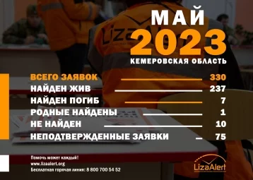 В мае в поисково-спасательный отряд «Лиза Алерт» в Кузбассе поступило 330 заявок на поиск пропавших жителей. Волонтёры опубликовали ежемесячную статистику поисков.