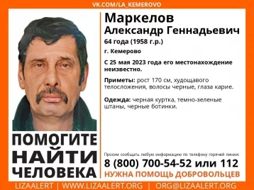 Волонтёры поисково-спасательного отряда «Лиза Алерт» в Кузбассе сообщили о бесследном исчезновении кемеровчанина 1958 года рождения. Местонахождение Маркелова Александра Геннадьевича остаётся неизвестным с 25 мая текущего года.